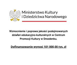 𝗖𝗲𝗻𝘁𝗿𝘂𝗺 𝗣𝗿𝗼𝗺𝗼𝗰𝗷𝗶 𝗞𝘂𝗹𝘁𝘂𝗿𝘆 𝘄 𝗗𝗿𝗲𝘇𝗱𝗲𝗻𝗸𝘂 otrzymało dofinansowanie ze środków 𝗠𝗶𝗻𝗶𝘀𝘁𝗿𝗮 𝗞𝘂𝗹𝘁𝘂𝗿𝘆 𝗶 𝗗𝘇𝗶𝗲𝗱𝘇𝗶𝗰𝘁𝘄𝗮 𝗡𝗮𝗿𝗼𝗱𝗼𝘄𝗲𝗴𝗼 w ramach programu 𝗜𝗻𝗳𝗿𝗮𝘀𝘁𝗿𝘂𝗸𝘁𝘂𝗿𝗮 𝗱𝗼𝗺ó𝘄 𝗸𝘂𝗹𝘁𝘂𝗿𝘆 na „𝗪𝘇𝗺𝗼𝗰𝗻𝗶𝗲𝗻𝗶𝗲 𝗶 𝗽𝗼𝗽𝗿𝗮𝘄𝗮 𝗷𝗮𝗸𝗼𝘀́𝗰𝗶 𝗽𝗼𝗱𝗲𝗷𝗺𝗼𝘄𝗮𝗻𝘆𝗰𝗵 𝗱𝘇𝗶𝗮ł𝗮𝗻́ 𝗲𝗱𝘂𝗸𝗮𝗰𝘆𝗷𝗻𝗼-𝗸𝘂𝗹𝘁𝘂𝗿𝗮𝗹𝗻𝘆𝗰𝗵 𝘄 𝗖𝗲𝗻𝘁𝗿𝘂𝗺 𝗣𝗿𝗼𝗺𝗼𝗰𝗷𝗶 𝗞𝘂𝗹𝘁𝘂𝗿𝘆 𝘄 𝗗𝗿𝗲𝘇𝗱𝗲𝗻𝗸𝘂.”